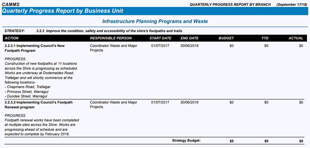 For a selected financial year and quarter, this report contains all Action Plans with budget YTD and actual figures for the year. It also contains the comments field for progress comments, a budget summary with budget figures and actual figures and a Strategic KPIs summary with targets and actuals for the year.